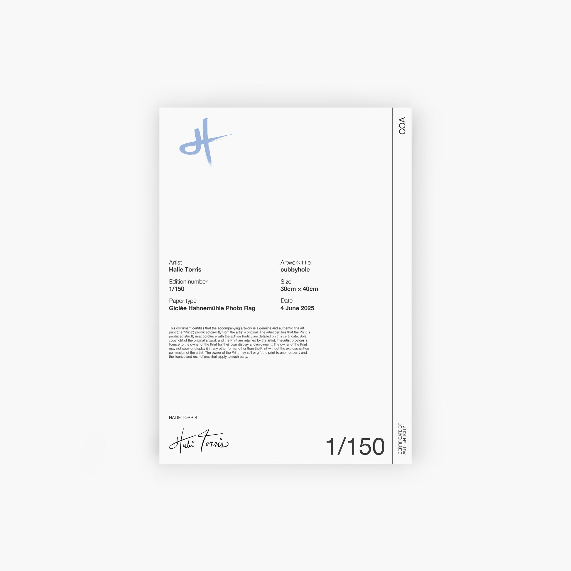 - Presented on acid-free, archival textured cotton PhotoRag Giclée paper, from Hahnemühle