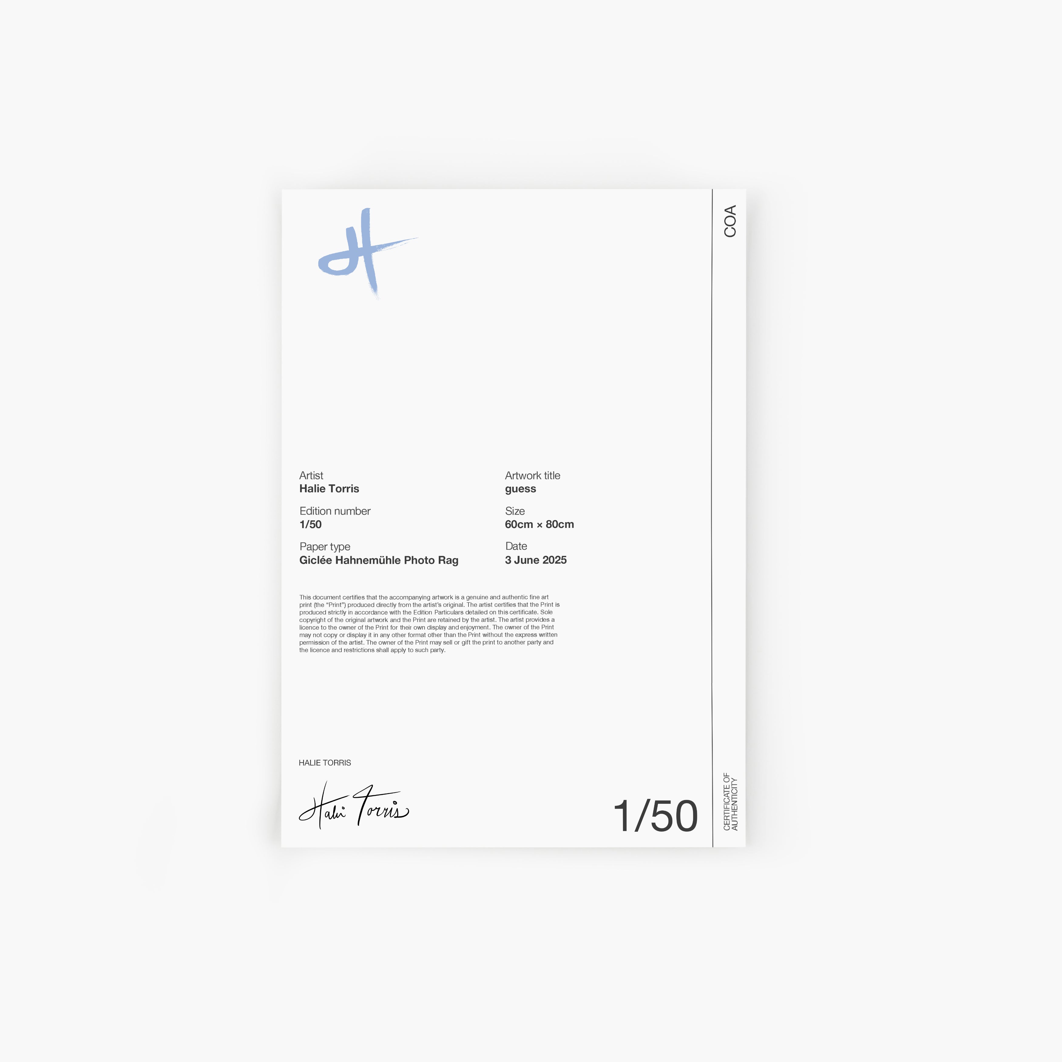36"x48" / 90x120cm, edition of 25 - Presented on acid-free, archival textured cotton PhotoRag Giclée paper, from Hahnemühle